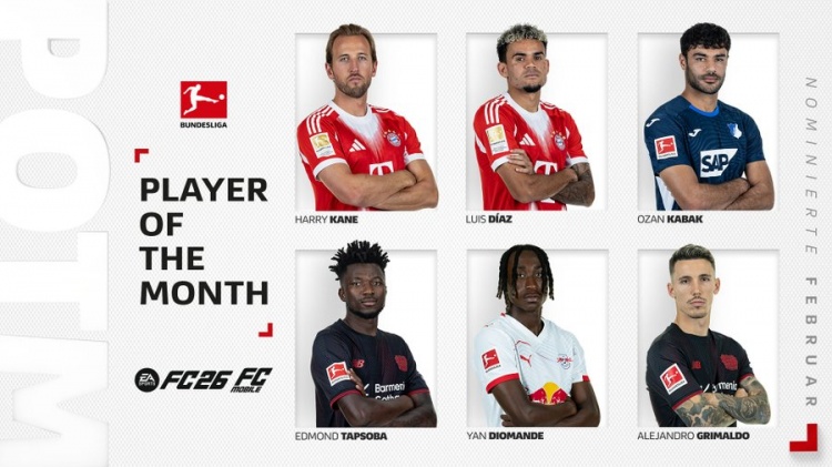 3月4日讯 德甲官方公布联赛2月最佳球员候选,凯恩、路易斯·迪亚斯、扬·迪奥曼德等6名球员在列。
